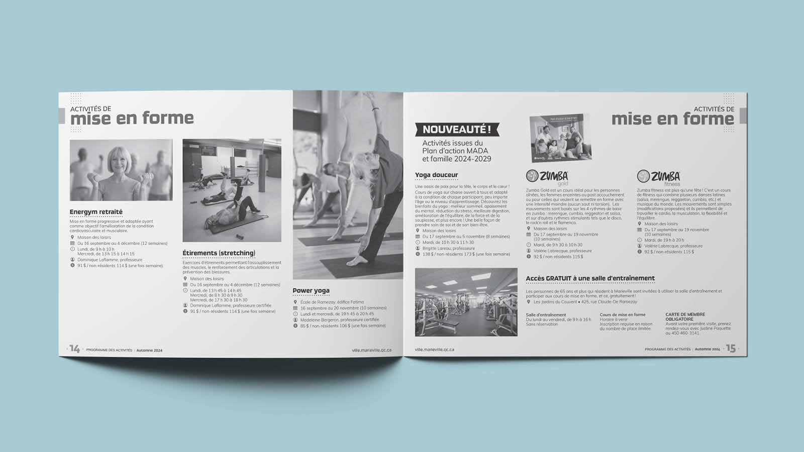 La Ville de Marieville fournit par la poste, quatre fois par année, à ses citoyens un programme d’activités. Pour une deuxième année consécutive, j’ai le plaisir d’en assurer la mise en page.