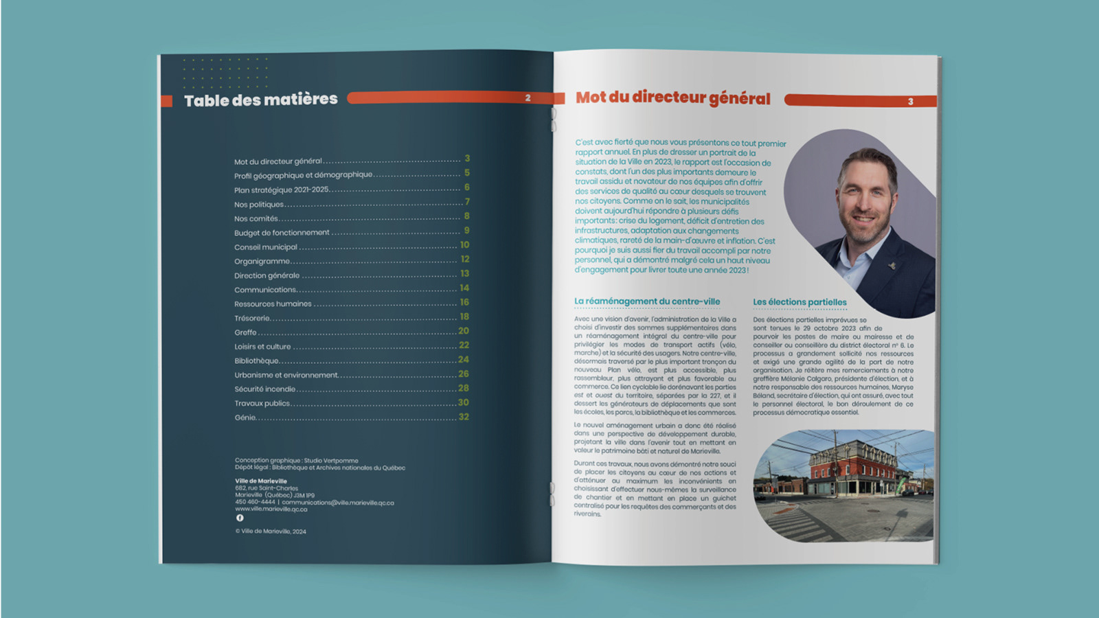 La Ville de Marieville à produit son premier rapport annuel. J'ai eu le plaisir de concevoir le design et la mise en page de ce beau documents de 34 pages.